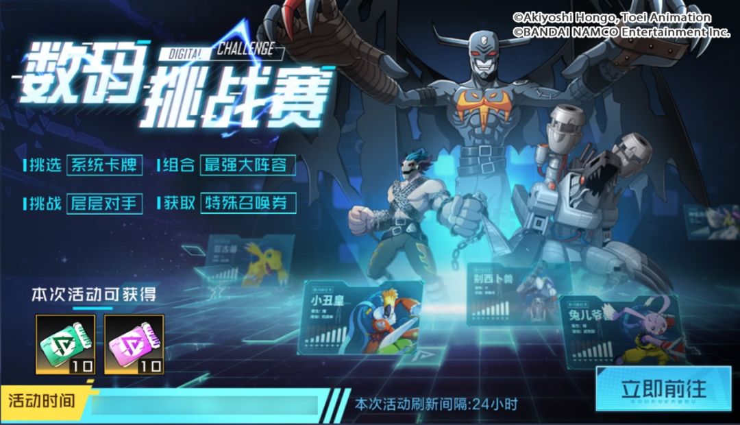 数码挑战赛即将开启,各位队长在活动期间内,前往活动中心即可参与数码挑战赛。队长们可在系统随机生成的数码宝贝中,任意挑选最多10张数码宝贝卡牌。