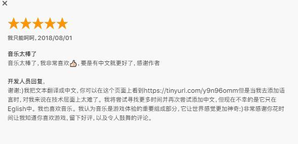 这是一位海外开发者,但是对于国内玩家的评价都用中文给予了回复,很用心。