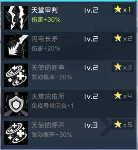 得意技是给奥义技加被动,起手释放奥义,相当于给对方主目标挂一个减速300的一回合buff,还给每个队友加20%暴击率和300速度持续一回合。PVP用它能站先手优势,用来PVE也是不错的辅助,而且配任何阵容都合适(速度选手,当之无愧的风神)