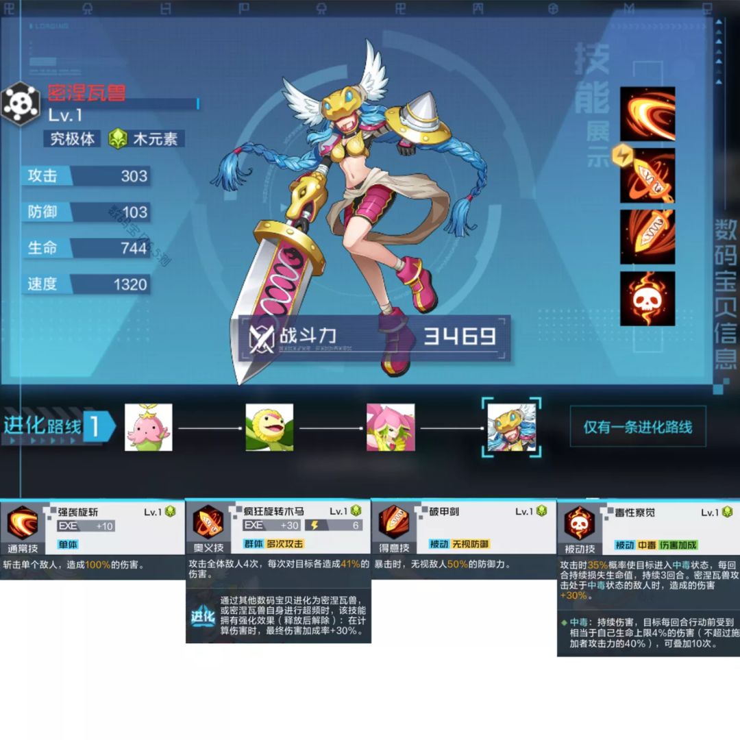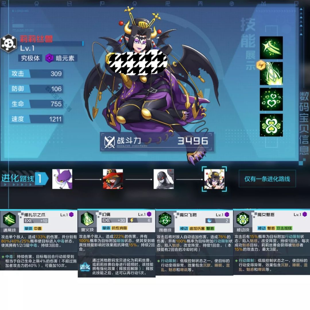 从技能看是个很不错的辅助数码兽,有控制,自带恢复,有一定伤害,只要全点防御和效果命中就好了(实际效果还以游戏内为准)通用类数码兽