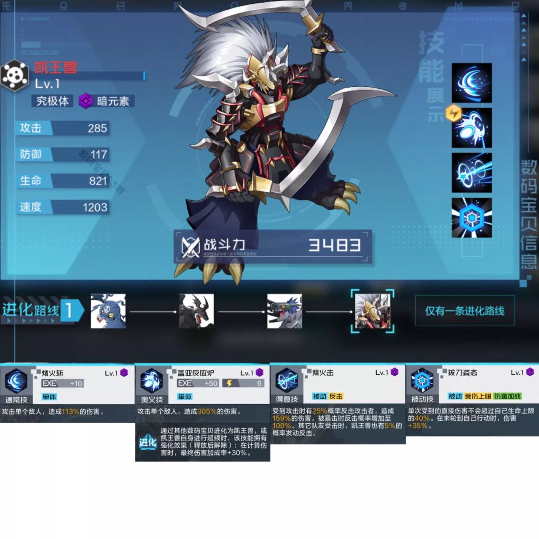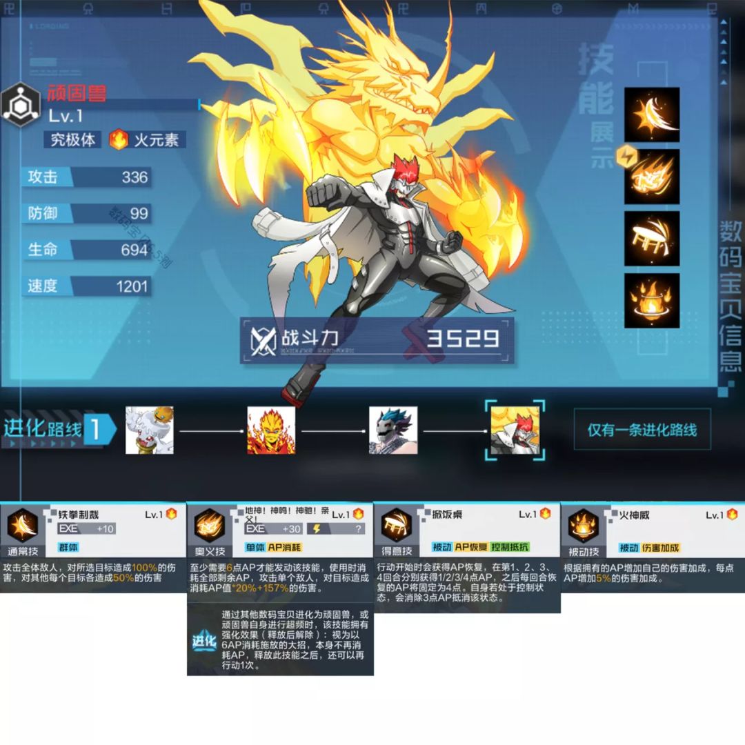 1、奥义过后下个回合根据火属性数码兽数量提高攻击力,且无视百分之百的防御,副作用攻击敌人是随机的