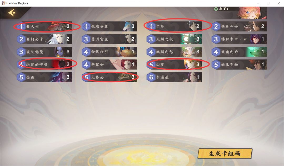我们这套卡组的制胜点还是蛮多的,前期理想的情况就是三鹿配合阿凡达,直接压死敌人。中期靠妖精配合洪荒的呼唤,之后就是李逍遥、赤王配合buff的经典体系了。不知道大家有没有注意,我这套是带了灵月宫主的,因为咱们这套卡组是有一定量的回复,而且食人树也会给自己造成伤害,这样咱们就可以更好的触发宫主的异能效果,如果减费到key牌,那么我们的斩杀将会更加的容易了呢,更何况咱们的宫主在宿命的情况还可以补牌。