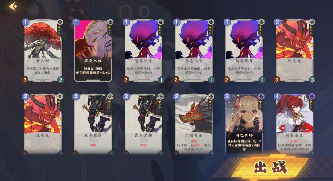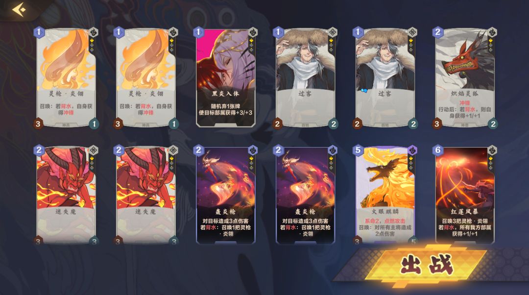 推荐升级卡牌:轰炎枪(1级)、年兽化身(1级)、朱雀化身(满级)、致命背叛(满级)