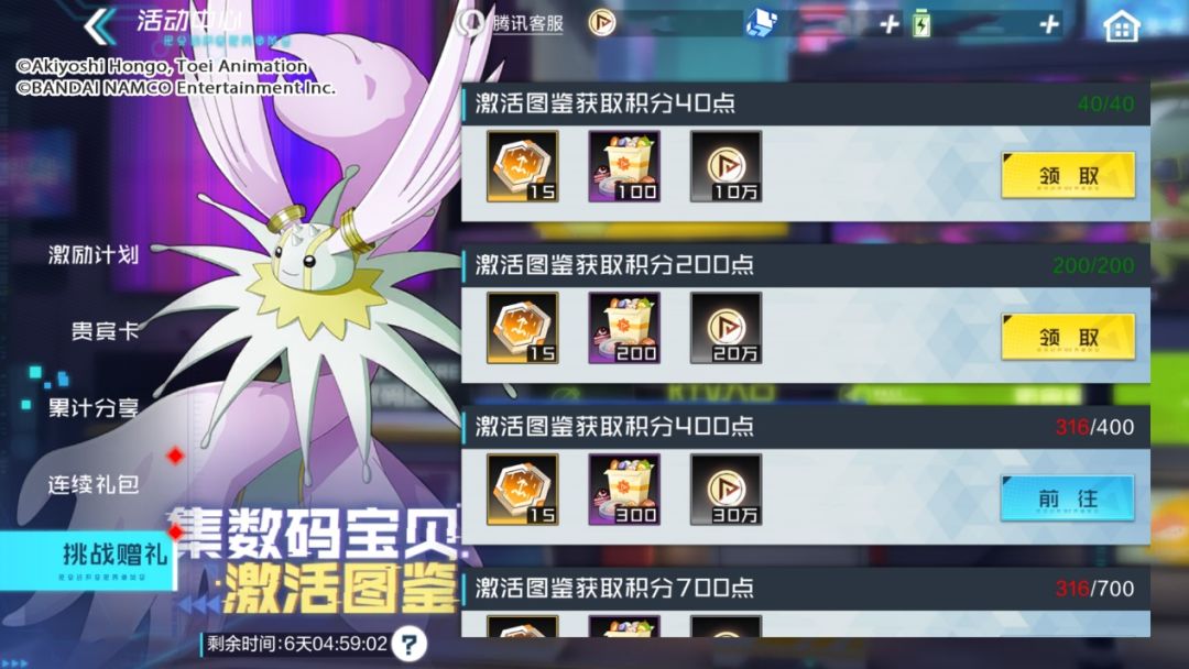 活动期间,队长们通过收集各类数码宝贝,同时消耗资源不断进化,即可激活对应的数码宝贝图鉴,获得相应数量的活动积分。随着游戏内数码宝贝的持续进化,积分奖励也将越加丰厚。