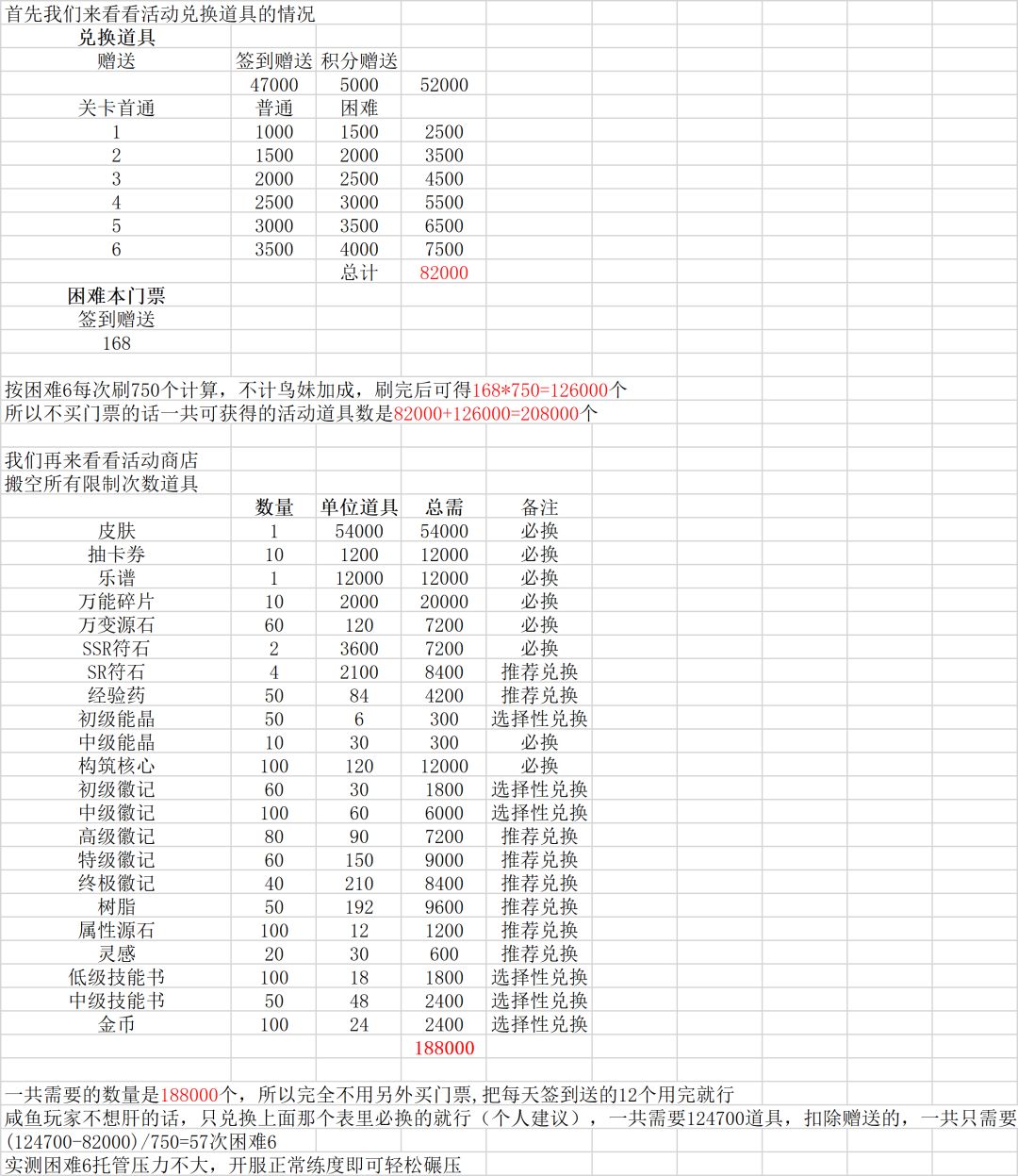 首先说结论,保证每天登录的情况下,不用额外买门票足够把商店搬空,这还是我没有计算鸟妹加成的情况