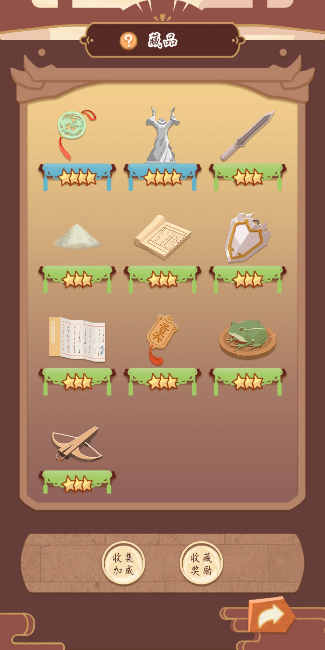 收藏:九鼎集齐会有百分之20的收益增幅 推荐升级明月珠 日观鼎 东原鼎 青囊书 龙凤呈详 剩下的绿色收藏也可以升一下,贵宾令牌一定要先升。