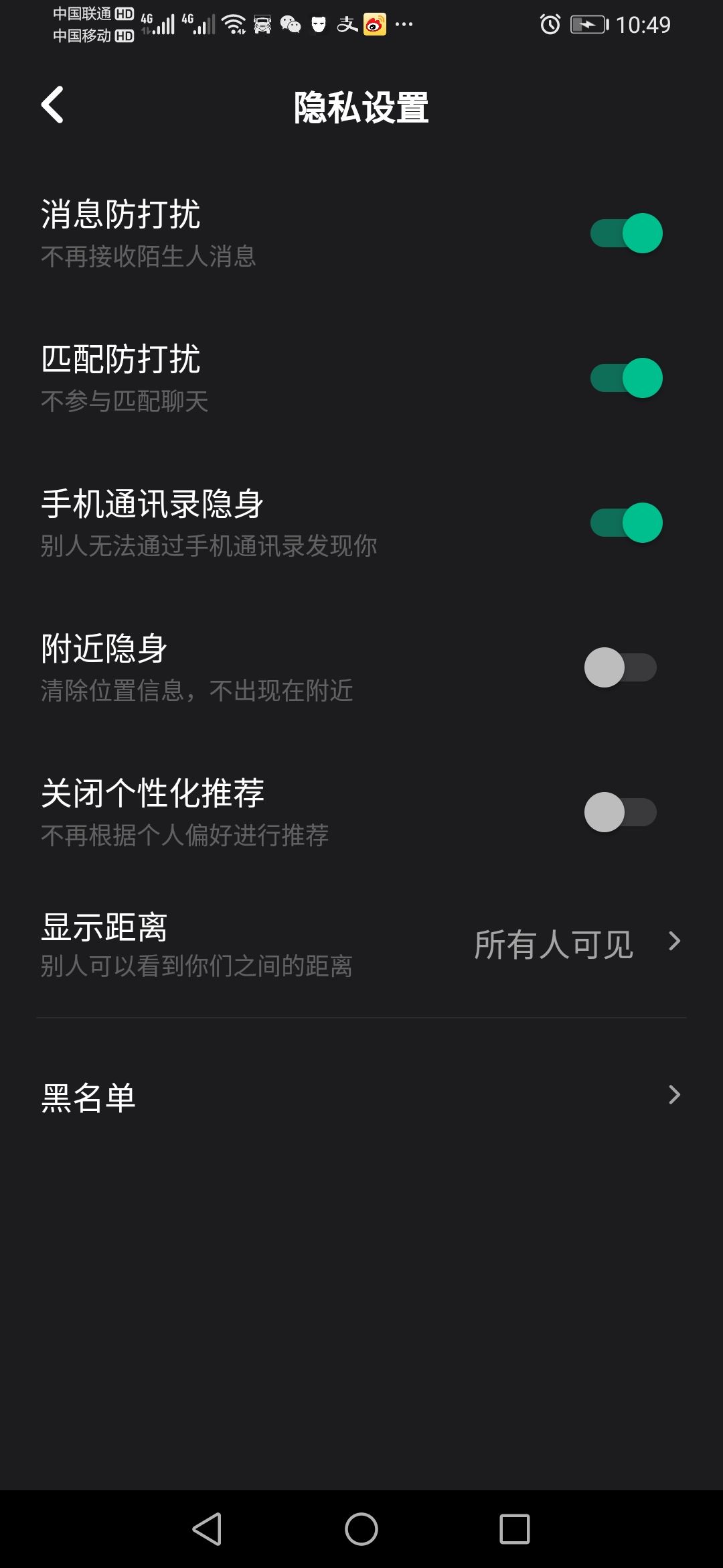 于是我询问了朋友该怎么办,朋友说有个隐私设置,把里面的消息防打扰打开,匹配防打扰打开,陌生人就给你发不了消息了,我就按照他说的设置了一下,果然管用。