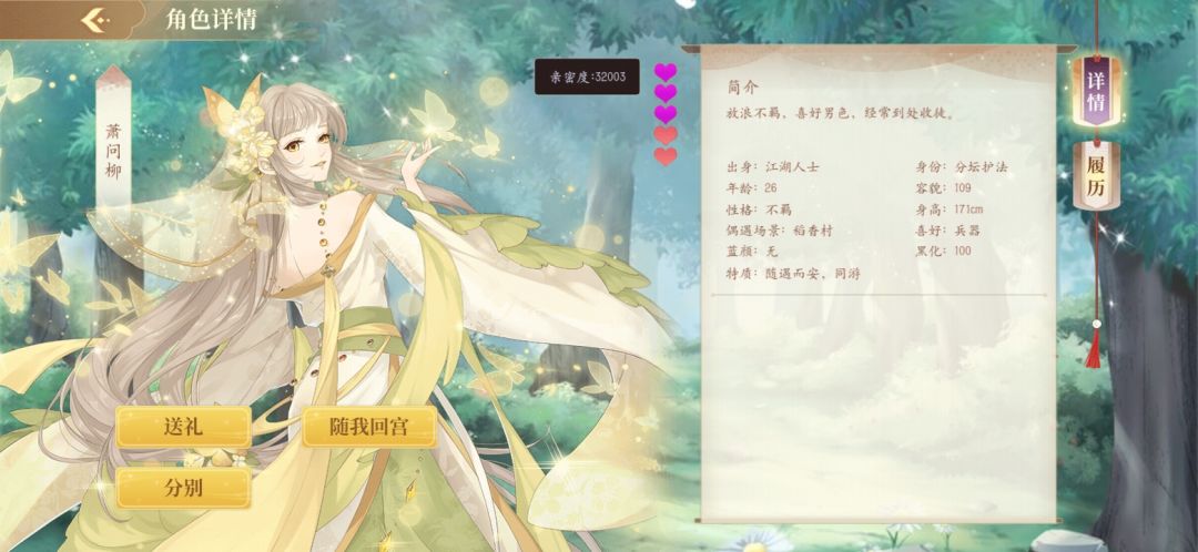 截图里是我的萧问柳亲密度到达三万二的时候,这时才出现随我回宫的选项,点了后选择“我希望你陪在我身边”就可以带回宫了。