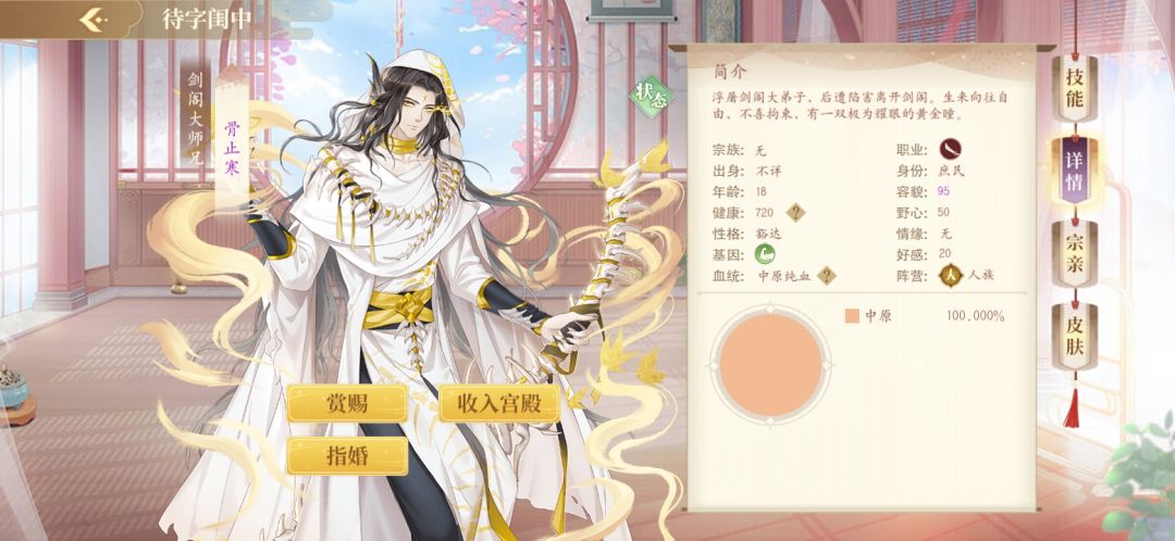 三个娃都是满血中原,永生状态,可随意指亲迎娶,科普一个小知识,只有骨止寒是绝版立绘,萧问柳和词牌金同图鉴,禹重泽和冥神金同图鉴。