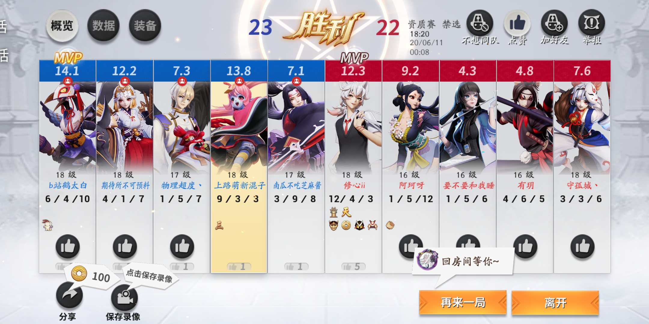 本来我们准备投了结果来这一出,绝活阵容,上单姑姑,中单鬼切,打野御馔津,下路跳妹,辅助大天狗。御馔津还挂机了2分多钟,都不太想打了,然后妖狐开始嘲讽。