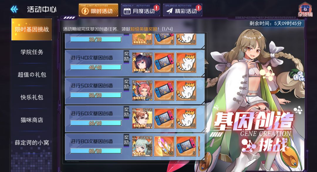 4、每日奖励:活动期间,每天登录游戏可获得超级基因x1。5、限时基因挑战:活动期间,进行基因创造达到指定次数可获得丰厚奖励。(活动期间最高可完成4轮)
