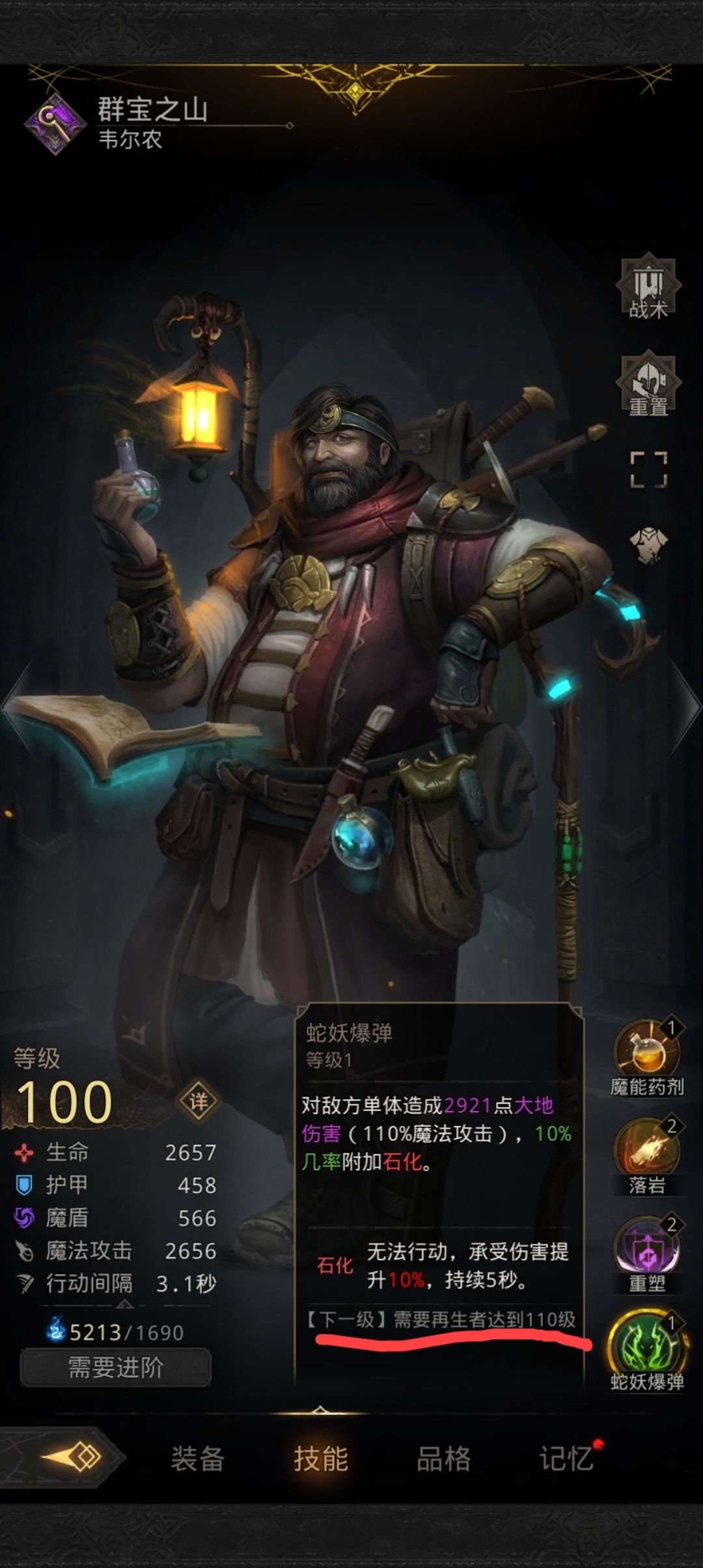 1.群宝必不可少,装备4+70,最好4+100,不强求。技能只开石化。