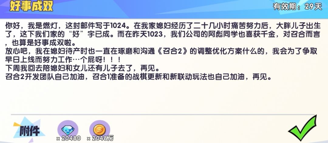 你好,我是燃灯,这封邮件写于1024。在我家媳妇经历了二十几小时痛苦努力后,大胖儿子出生了,这下我们家的“好”字已成。而在昨天1023,我们公司的阿彪同学也喜获千金,对召合而言,也算是好事成双啦。