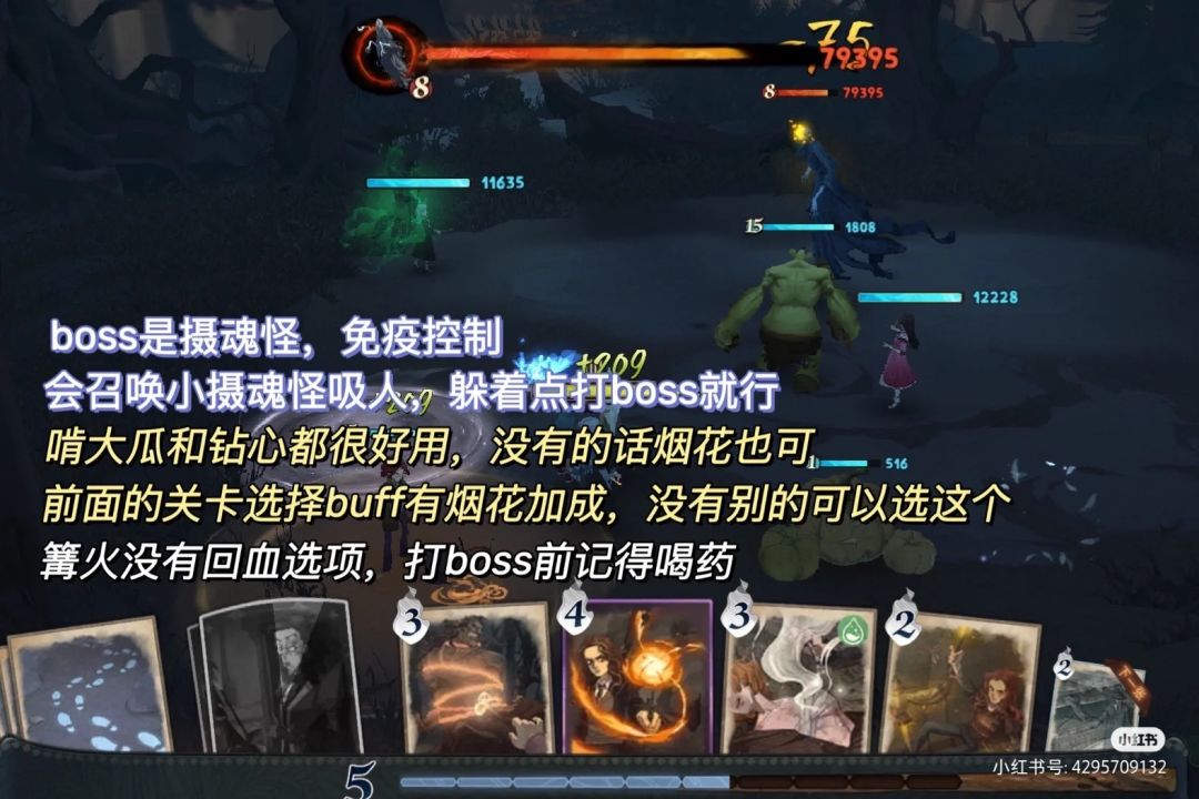 5、队伍里有啃大瓜和钻心打boss会更简单,因为boss是摄魂怪,免疫控制又一直移动,所以烟花炸的时候容易漏伤害,黑魔法就没有这个困扰,我这小号没抽到这俩,所以我就带烟花狂炸了(前期还会有特定魔咒的增强buff,我选的就是烟花的