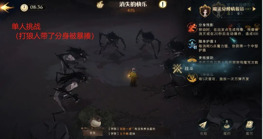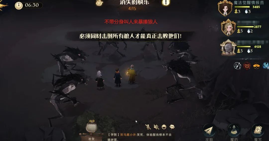 2、狼人关第一次见容易心态崩,实际上操作起来还行,可以用迷雾让狼人失去目标,然后飓风咒吹出去,这时候狼人会很轻易的被吹走,狼人在远处了就可以先压一波血线,然后和队友沟通好手里捏着烟花,一个禁锢三个烟花砸下去,直接一次性结局,不然他们反反复复的复活真的很烦