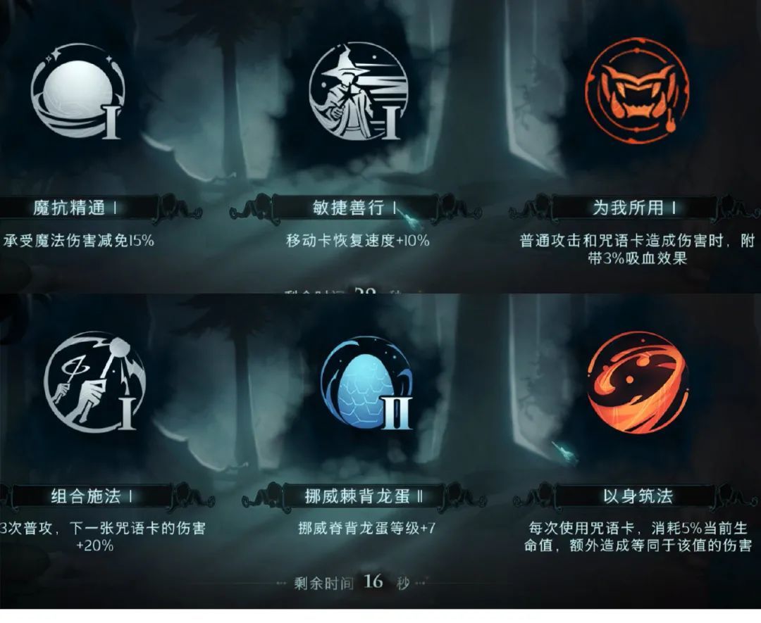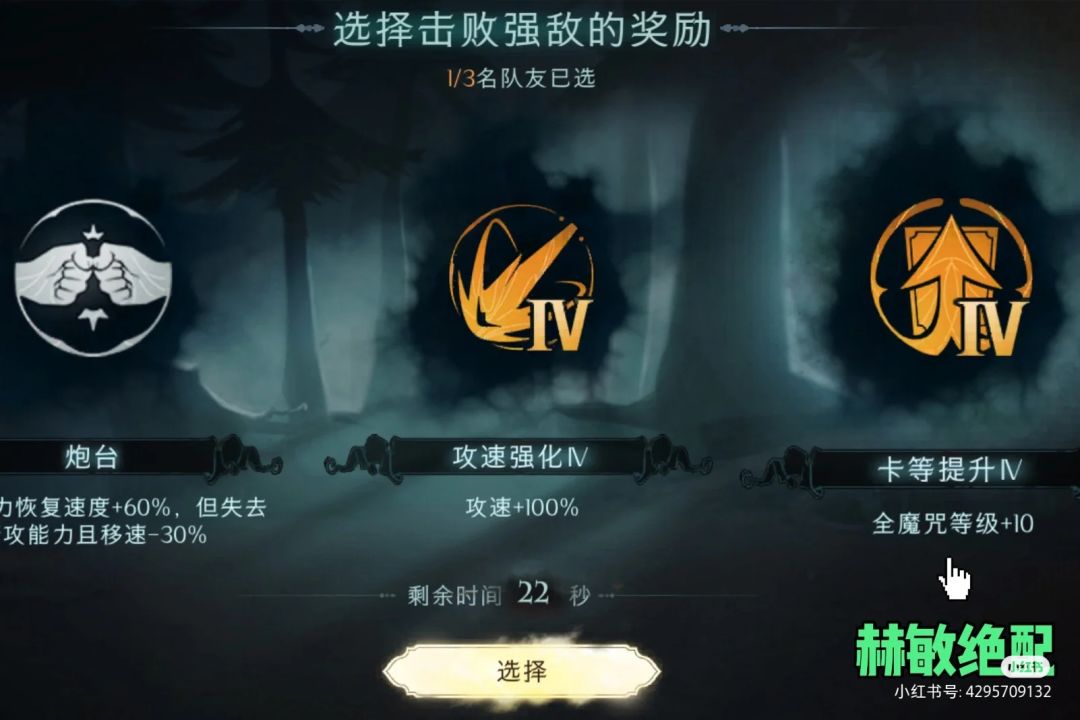 4、选择buff的时候优先选魔咒增强和回回蓝加速,因为我们主要是赫敏回响带咒语卡,所以这两个buff巨好用