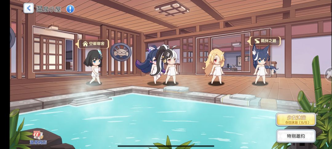 新好感度获取功能,每天可以选五名角色(划,老婆)泡温泉,泡温泉时可以消耗温泉道具获得额外奖励。