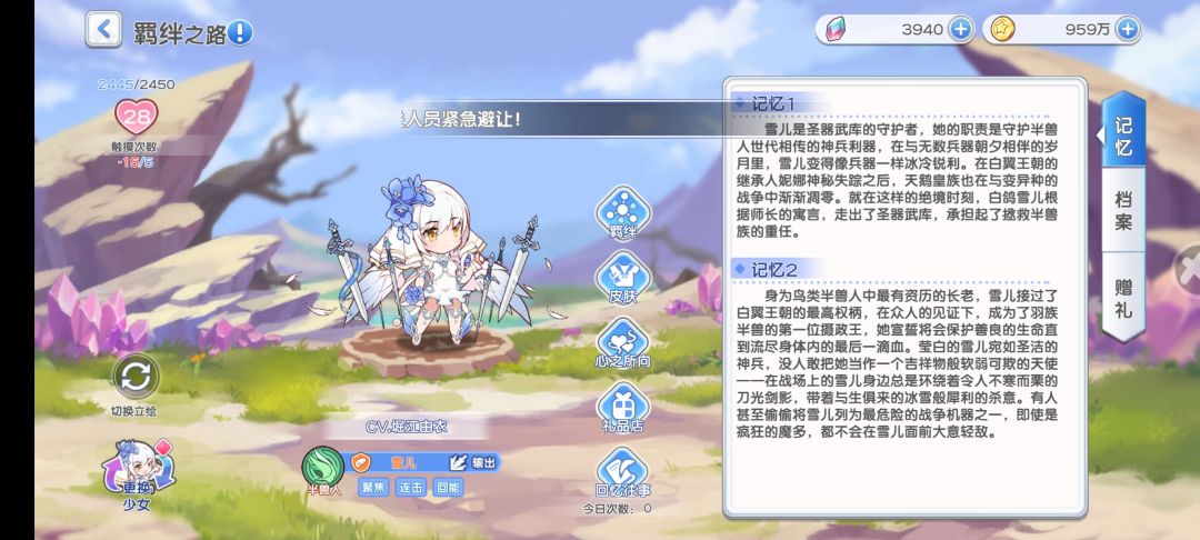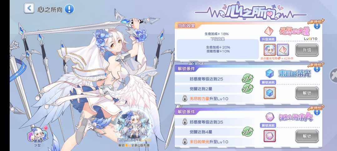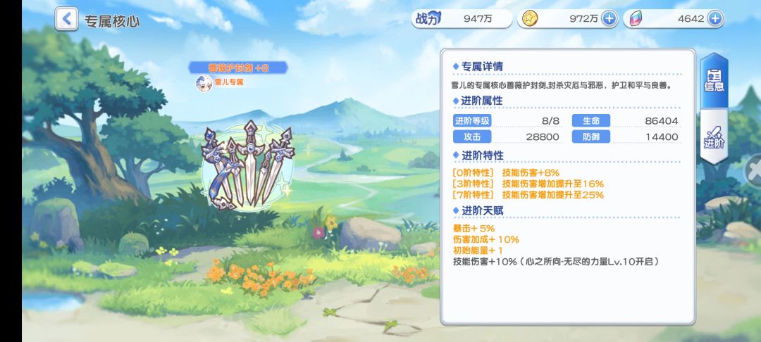 5.培养雪儿的玩家建议角色觉醒四星就可,然后120个碎片先拿去解锁完心之所向第一阶段。(角色碎片最好不要换材料,不值得)