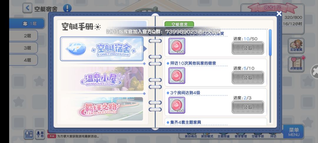 原宿舍功能,目前增加空艇手册以及拜访功能。空艇手册应该是后期获得大量家具币的主要渠道,主要满足条件就能领取大量家具币。拜访功能是新获取友情点的渠道。(每天上限10点友情点)