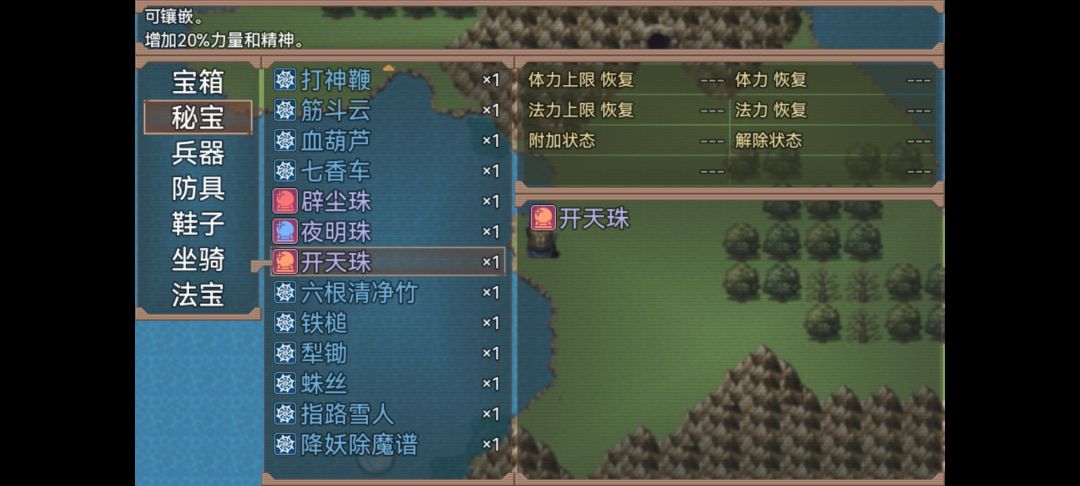 属性:加20%力量和精神,杨戬和小龙女坐骑可镶嵌,建议给法系主输出镶嵌,杨戬法术聚气成元加幻风影配合法宝日月可以打主输出,怪多时就用聚气成元加幻雷神,小龙女法术缪魂术配合法宝八卦云光帕也可以打主输出,不过小龙女的职责更多是加血,所以开天珠我给了杨戬