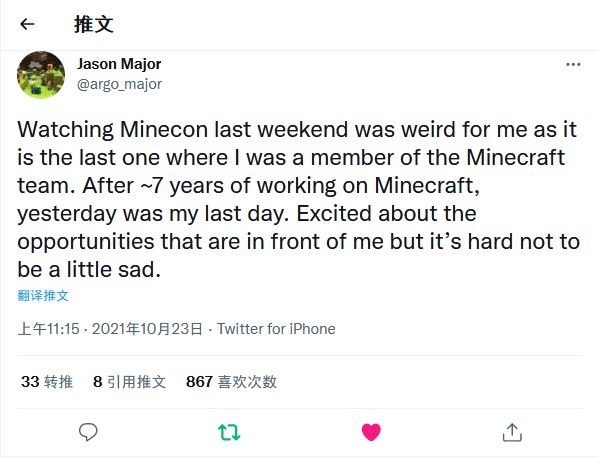 基岩版开发者Jason宣布离职,他已在微软已经工作7年,是基岩版高速发展时期(0.12-1.2)比如活跃的开发者;顺便,在这个期间同样很活跃的前基岩版开发者Tomcc已经在去年年底离职,他曾在2016年与Jens一同来过ChinaJoy,是前Mojang基岩版团队核心开发者