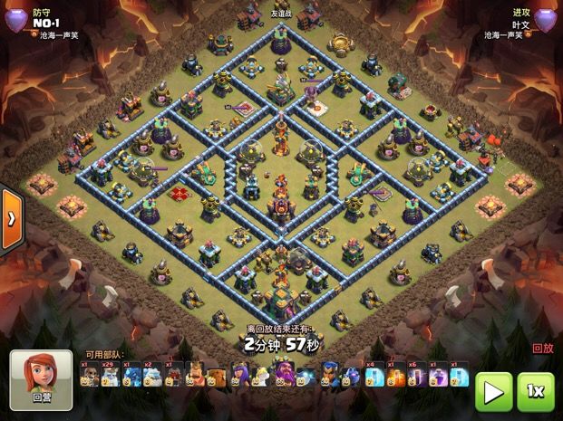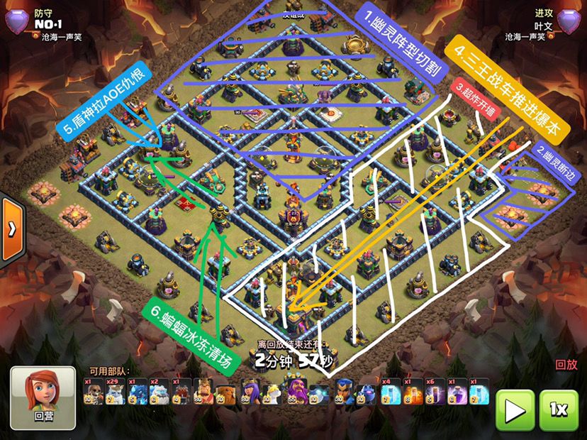 毕竟14本多了2门投石炮,进攻思路还是要有所变化的,不能像以前那么无脑了,其中九宫格阵我感觉比较好打,幽灵阵型分割后,滚木车的路线就很清晰了,3王配合冰人推进,可轻松到达大本那,此时2/3的建筑已倒,剩余蝙蝠冰冻清场,盾神沦为吸引AOE建筑的工具人。