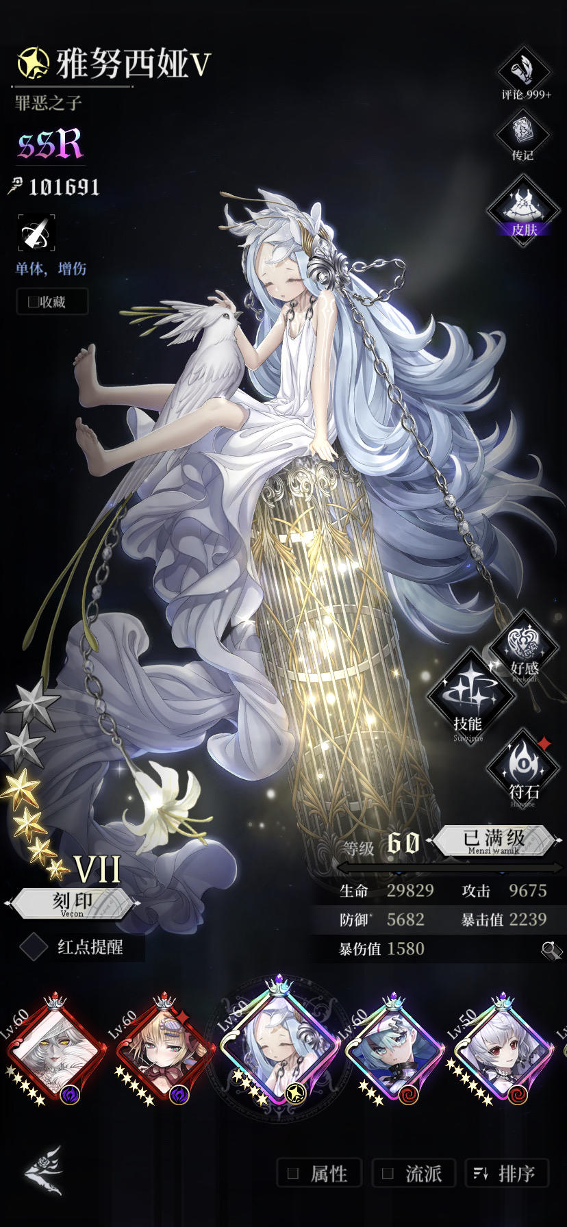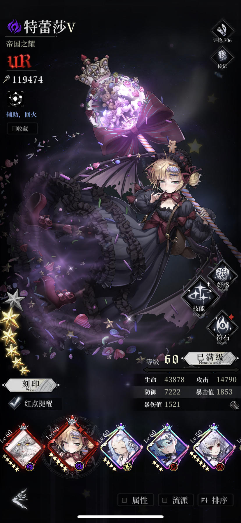 就剩搞一套ssr符石和法典等级了,雅努差十个碎片五星,符石都没搞好,还有俩自选箱子,看下一个ssr歪吉他夏伦还是糖果了,要是都不出就只能靠万能碎片把吉他上五了,基本步入咸鱼阶段,反正手残,冲分冲不上慢慢混,总共冲了86,运气好前期基本三四十发出一个ssr,反正冲这牢牢把握住玩家的立绘冲点也不亏,没准过段时间不瘾这个