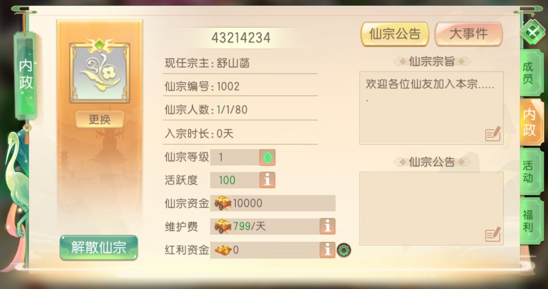 上仙们可以通过完成日常任务,提高仙宗的活跃度,完成仙宗任务,提高仙宗贡献值,大家一起努力,共同建设仙宗。当然仙宗的等级越高,回馈给上仙们的福利也会更加丰富,其中包括每周得到的仙宗红利。接下来听宁宁简单说说活动和福利吧