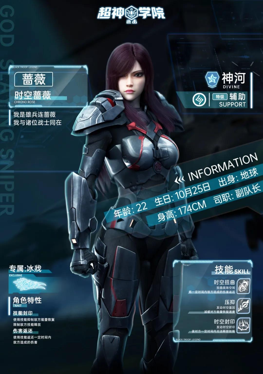 蔷薇出生在军人家庭,父亲杜卡奥只会用军人的标准去要求她,而从不会去顾虑她心底的想法,所以年少时的蔷薇是格外叛逆的。直到18岁进入军队之后,蔷薇才逐渐洗去叛逆,蜕变成了一名合格的超级战士。在超神学院中,她执行了数不清的任务,也被赋予了最多的使命。