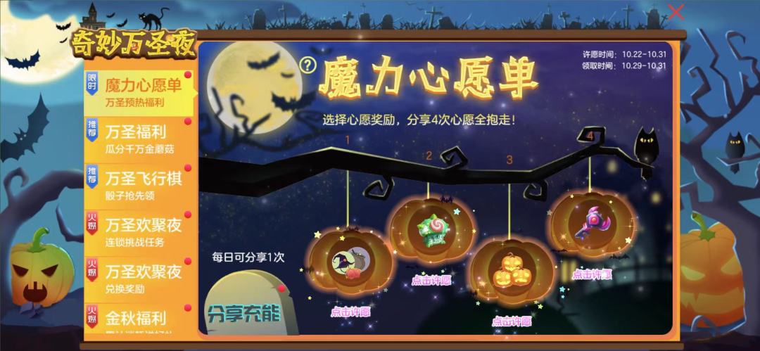万圣节就要到啦,波拉哩出现了神奇的魔力心愿单!分享活动并选择你的心愿就可以获得专属奖励,万圣节专属皮肤、孢子还有超大奇妙宝箱钥匙全都给你!快来分享充能,领取你的万圣专属奖励吧!
