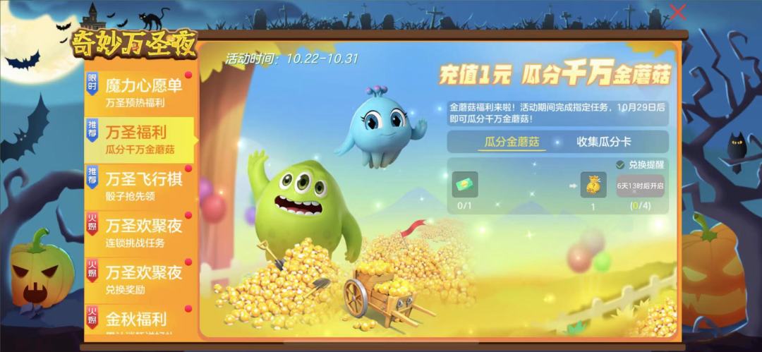 即日起至10月31日,完成指定任务,10月29日后即可瓜分千万金蘑菇!