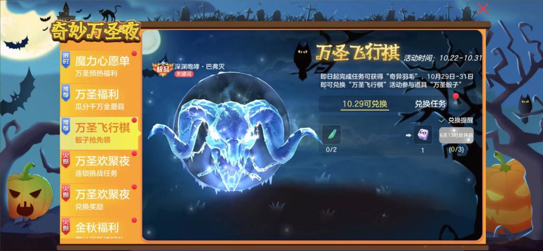 即日起完成任务即可获得“奇异羽毛”,10月29日-10月31日兑换“万圣骰子”参与“万圣飞行棋”活动。