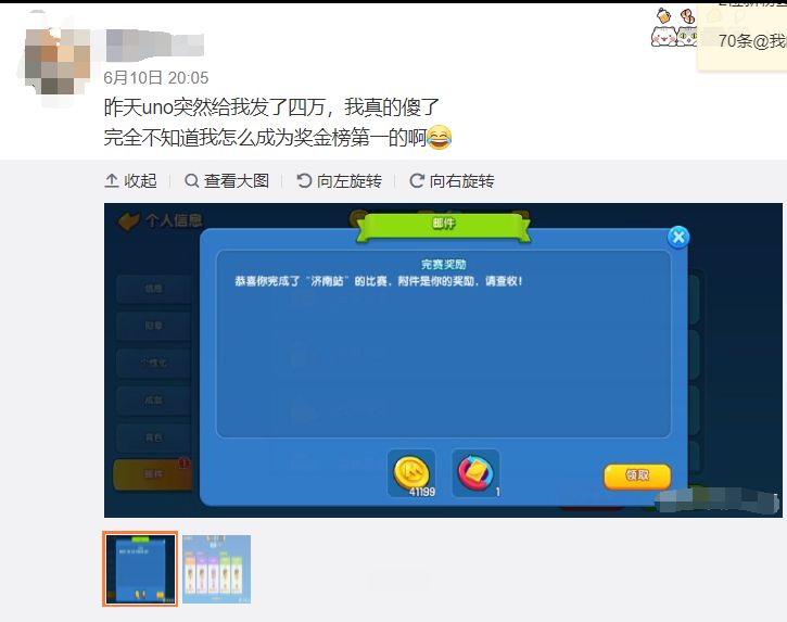 微博上的小伙伴纷纷表示“我傻了,为什么官方送我钱?”不,你没有傻,是我们开发组“傻”了,巡回赛周赛15场完赛就送4w+金币,就是这么“傻”!