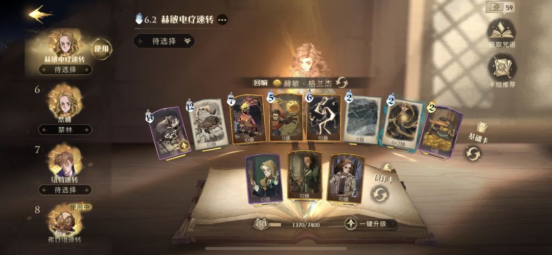 仍然是核心三张卡,然后赫敏会带飞沙走石、云雾飘渺两张低费咒语卡加一张闪电风暴;有些人会带万弹不带雾;然后赫敏会额外带一张三头犬。