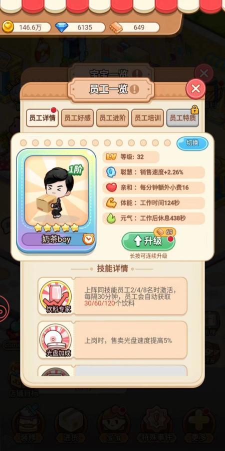 员工升级可以提升员工的基础属性,员工属性包括四个方面:聪慧-可提升销售速度,亲和-可增加员工的小费收入,体能-可提升员工的工作时间,元气-可缩短员工的休息时间;