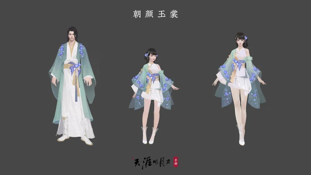 “玉裳”乃袁紫霞培育的知名朝颜花种,其朝暮为紫,晴晒为粉,沐雨而蓝;亦有人说,此花乃是融入了云城“五色琉璃花”之习性,乃成传奇。苏夜来以此花为灵感,裁制成衣。