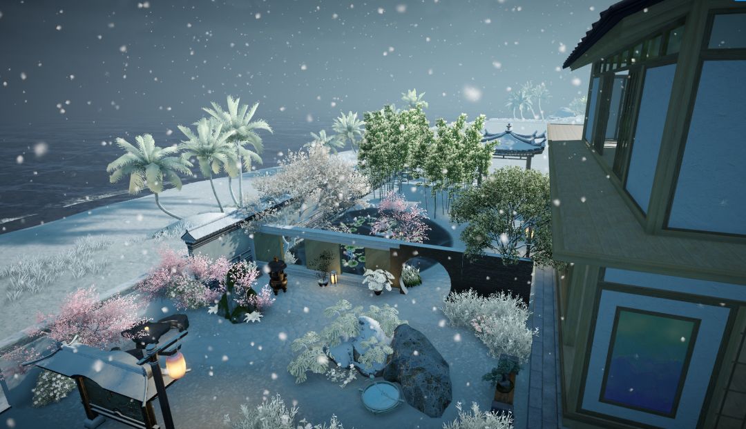 需要材料:热带蕨×2、樱花·二×2、木槿若干、樱花·四×2、沉岩·石桌×1、石凳·曲础×2、冒险家公告板×1、山石·陡峻×1、木质方灯×1、立方地灯×1、烛影方灯×1、龟背竹盆栽×1、翠竹盆栽×1、青铜香炉×1、郁金香×1