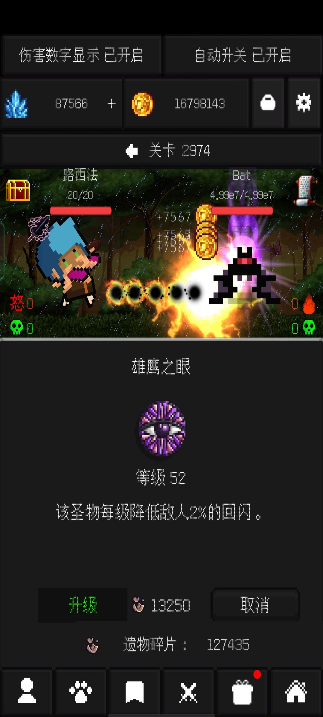 (细节要点)这套打法一定要前提是95%命中。敌方回闪为负数。50左右回闪就可以挂机2800关左右。攻速达到8.0。最后最最最最最重要的一点。挂机的前提一定是你能一下秒这个怪。最好的方法就是。你发现一下,打不死这个怪。然后挂这个层数往上50层,关掉自动升关。