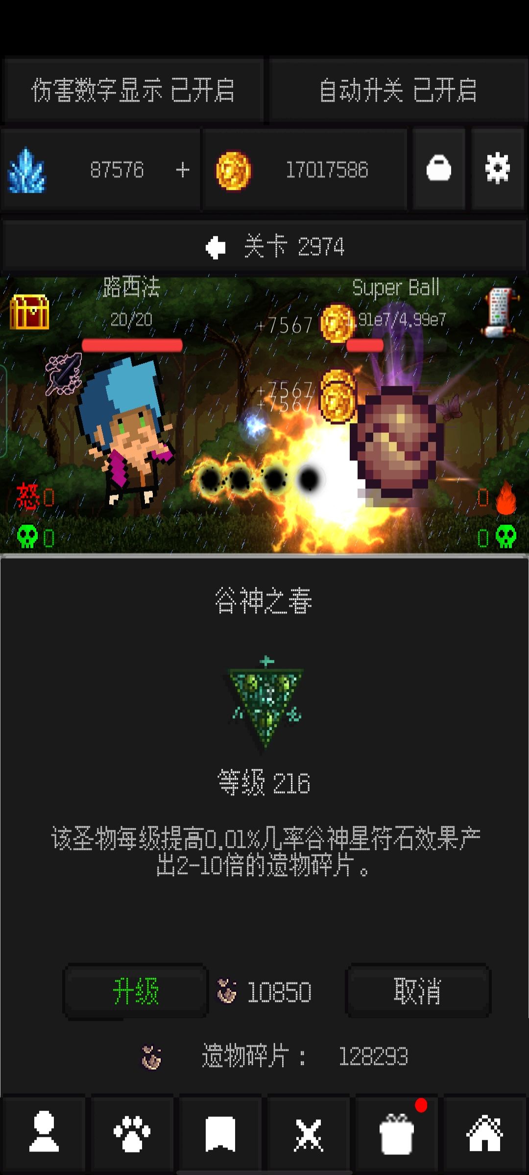 第二套:金星。只挂机。不可转生。不可转生。不可转生。重要的事情说三遍。因为金星每次攻击需要花费888金币。转身以后,前几关每次攻击金币就是负数。切记。采用这种方法的话。就可以不用升级能量石遗物。从而更快达到万爆。解放双手的方法。