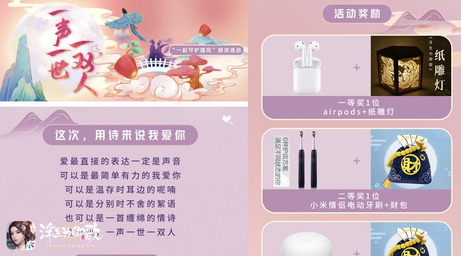在本次国风朗读活动中,阁下可在“喜马拉雅”APP中找到“一声一世一双人”活动参与线上录制并投稿,秀出属于你的“国风之音”。除线上活动外,阁下亦可在“喜马拉雅”线下读书亭,参与现场录制,直接参与活动。此外,参与活动便有机会获得AirPods、电动牙刷、《浮生为卿歌》人气周边等精美好礼呦!