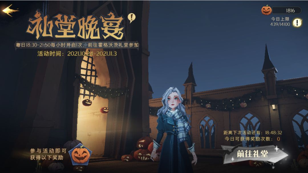 【礼堂晚宴】每日低保获取代币入口。10月31日晚上开启,之后每天开启时间为18:30~21:50,每间隔1小时开启一次,每次开启持续时间20分钟,每天总共会开启4次礼堂晚宴活动。每天可获得奖励次数为5次。