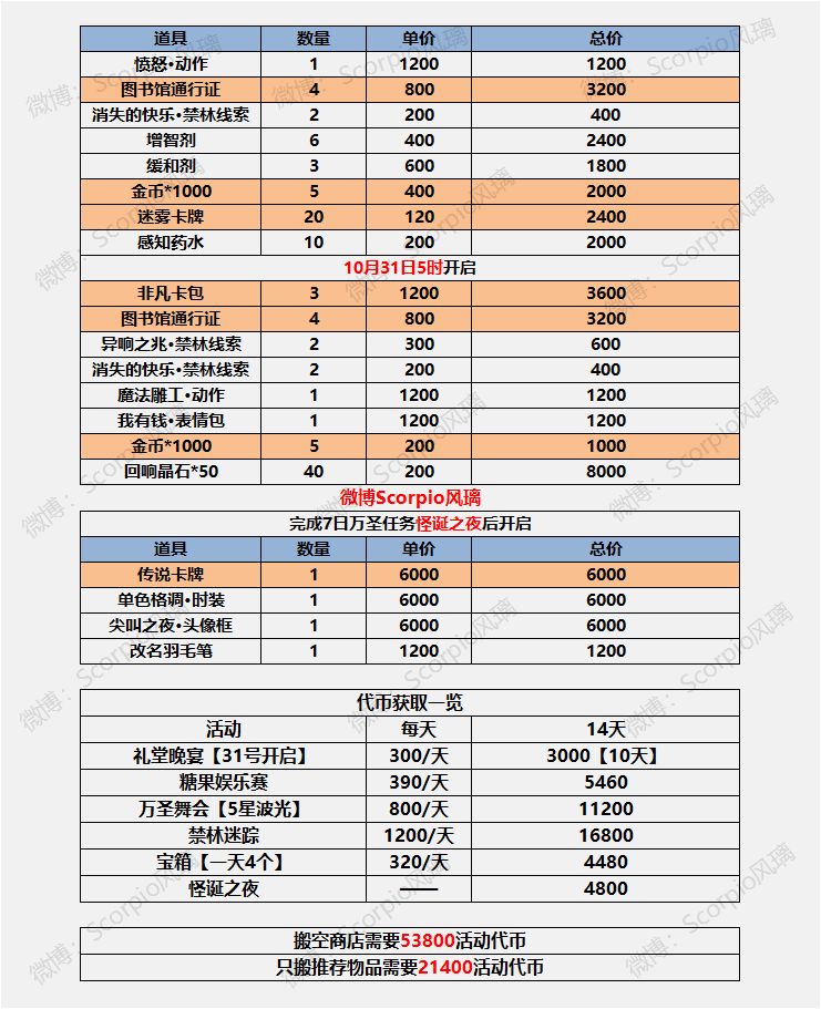 想搬空商店的肝帝玩家,活动14天上限每天刷满为2500*4+3300*10=43000,额外不占上限的为晚宴【10*300=3000】,每天有求必应屋2次【40*2*14=1120】,怪诞之夜七天任务【4800】地图彩蛋【1900】,加起来43000+3000+1120+4800+1900+=53820刚好够,中间每天再打打蓝色禁林和南瓜地精猜谜每次有几率拿30左右的不占上限的代币【概率猜对】。