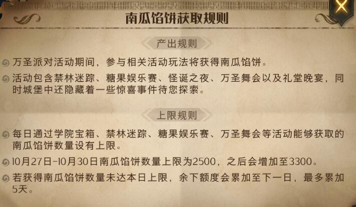 【其他】每日代币上限前4天为2500/天,第5天开始为3300/天,活动14天,一共43000的上限。当天未获取完的上限将会累计到下一天,最多累计5天。上述活动中万圣舞会、禁林迷踪、糖果娱乐赛、日常宝箱每天共同占用上限,不占日上限的每日活动有怪诞之夜、礼堂晚宴、有求必应屋,地图彩蛋给的代币为一次性的同样不算在上限内。
