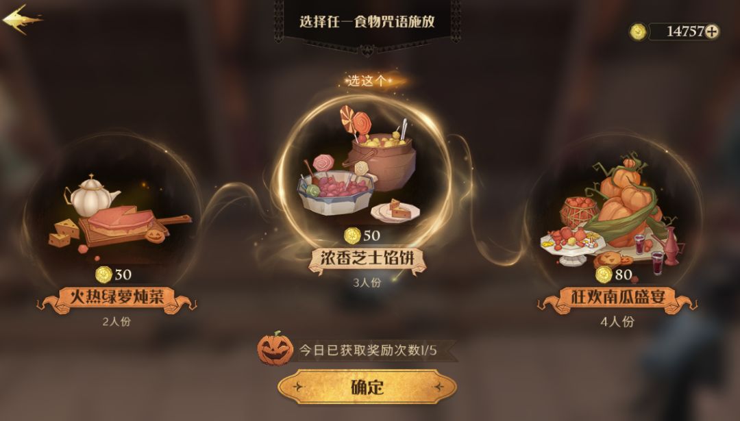 【礼堂内部】点击前往礼堂后会在场景看到很多餐桌,餐桌上会有两种状态,施放食物咒和用餐,注意这里用餐最好选择4人份的食物,也就是X/4的如下图所示,因为实测份数越少获得的活动代币越少不确定是否为概率问题,2人份的食物给30~40活动代币,3人份的给40~50活动代币,4人份的给60~70活动代币。如果场景无食物也可以自己花金币施放食物咒,施放食物咒所需金币如下图所示注意你施放的食物咒出来的食物其他人也可以用餐,每天可以获得5次奖励,大概每天可以获取的代币数量为300左右。