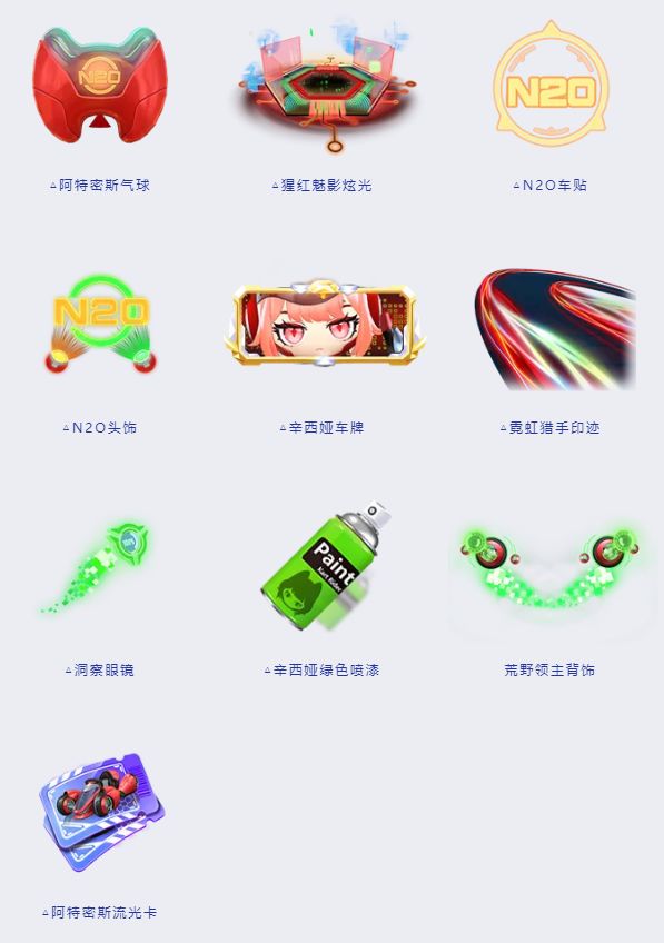 全新设计的阿特密斯系列道具,来自未来的设计理念,搭配上源源不断的月神氮气,将会带给你全新的竞速体验~