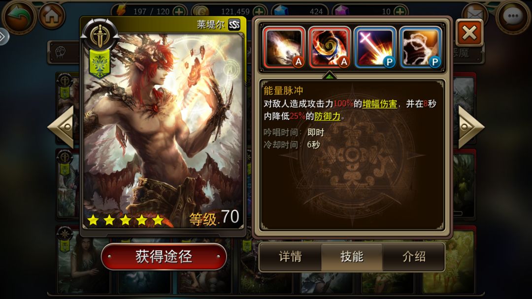 技能分析:一技能为贯通伤害,并降低敌方50%的攻击力,这个技能可以说是神技了,冷却6秒持续6秒,基本等于可以使对面其中一个角色的攻击力一直减少50%,而且可以在敌方要释放关键性的伤害技能时,降低敌方攻击而减少己方阵容的损伤。二技能为增幅伤害,并附带6秒的减防御效果,变相增加己方输出。三技能可以为自身提供行动条和暴击率(可以叠加),叠起来后1秒打一下,同时可以驱散自身的debuff,因为其极高的攻速,软控、流血等debuff对莱缇尔形同虚设。四技能驱散敌方增益,并造成贯通伤害,同样因为其极高的攻速,敌方的buff基本挂上就被驱散了,暴击时可以使敌方进度条后退,降低敌方的攻击频率。莱缇尔天克buff和debuff类角色,就像屠龙克制嘲讽角色一样。