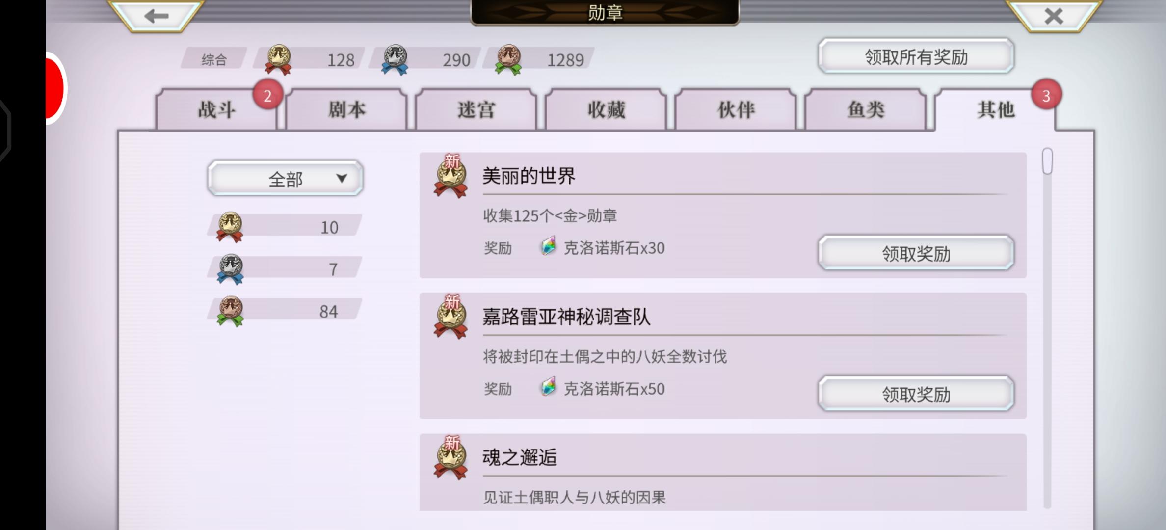 磨磨唧唧终于过了古八妖,其实早就打的只剩一个大螃蟹了,想等明芳出来打,结果池子沉了,就放着不想动了。今天用我没有风zone的风队打过了魔剑专武,又靠着专武魔剑打过了大螃蟹,可算是都打完了,继续咸鱼起来