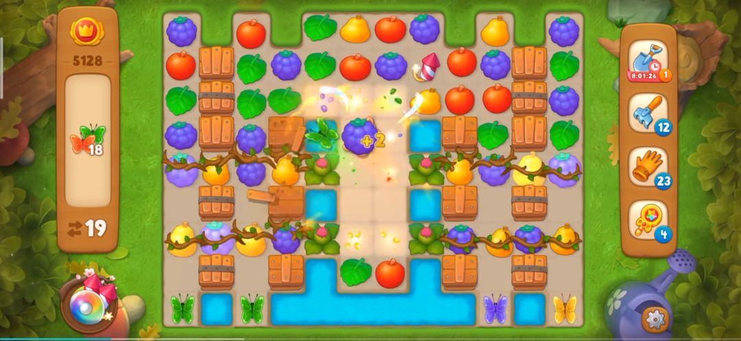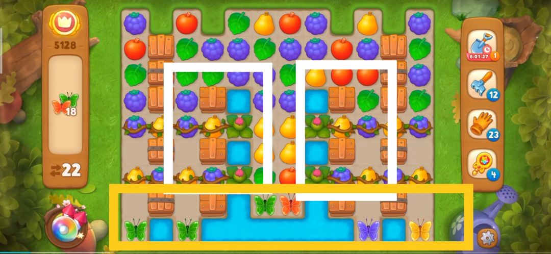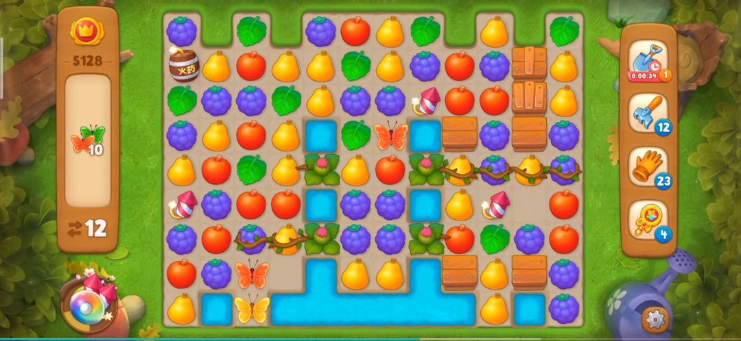 继续消除元素打开野草,同时注意蝴蝶的消除,不要让蝴蝶消失。