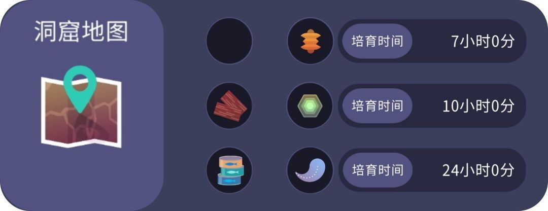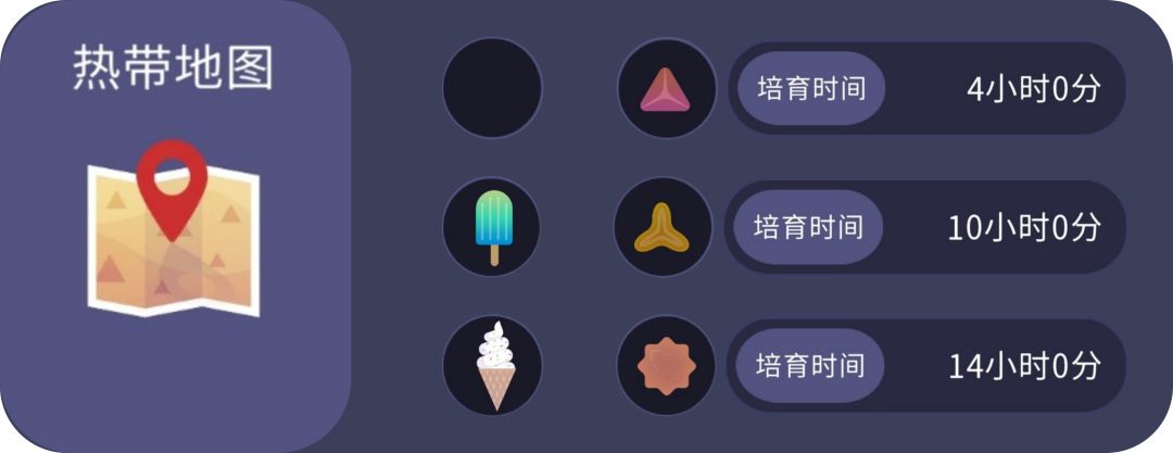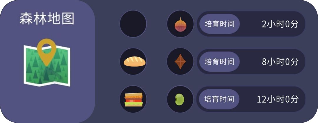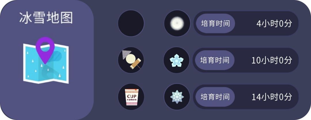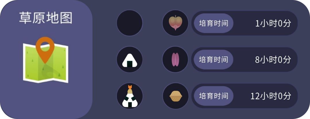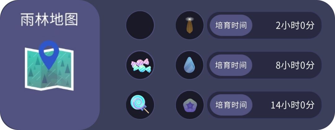 *以下图片表达的信息可能有些模糊……即:地图、零食(黑色图标代表无)、此种搭配带回的种子(为什么不加名字!)、该种子培育时间