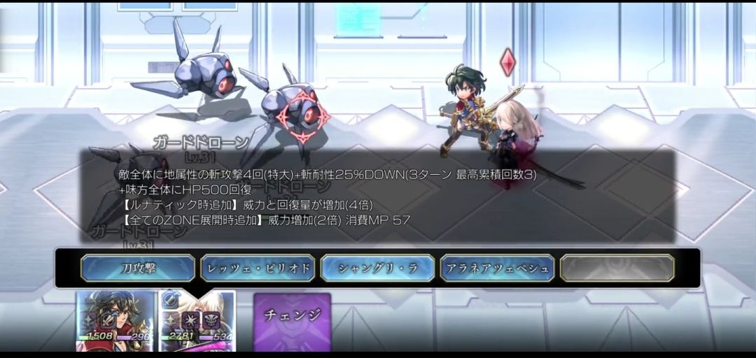 技能1:全体敌人地属性斩攻击4次(特大)+斩耐性下降25%(3回合,最高累积3次)+己方全体回复500hp
